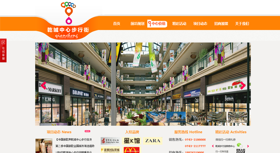 乾城中心步行街中心步行街是吉首集快乐购物、潮流娱乐、特色美食多种元素为一体的一站式步行街。项目涵盖电影院、KTV、西式餐饮、大型家电卖场、孕婴童天地、电玩、品牌服饰等,集中步行街“铺铺临街、独立产权、功能全、品种多、休闲娱乐氛围浓厚、聚集全城人气”的优势,同时结合万达购物广场“中心聚合力、高雅购物环境、合理人流导向、一站式购物中心”的特色,以最创新的建筑、最合理动线设置、最全业态、最具体验感等十大顶级价值,独创第7代步行街,成为吉首最繁华的消费聚集地!